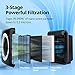 3-STAGE AIR PURIFICATION: Clean your air from 99.97% of particles dust, pollen, pet dander, smoke, and household odors. Stage 1: Pre-filter and activated carbon filter; Stage 2: True HEPA filter; Stage 3: UV-C light