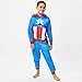 Crafted in a fuzzy blue polyester, the onesie mimics Captain America's iconic uniform in Red, White, and Blue