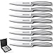 What You Get: This 16 pieces knife set covers a huge variety of knives: 8" chef knife, 8" carving knife, 8" bread knife, 6" santoku knife, 5" utility knife, 3.5" paring knife, 6 x 4.5”steak knives, 3.5" peeler and 5" kitchen shears, 8" sharpener and an acrylic stand.