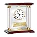 Luxurious tabletop mantel lunar circular rosewood desk clock design with black engrave plate and silver personalized text message. Nice gear display round shape clock has elegant roman numerals with see through dial clock face and deluxe quartz movement