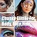 🔥Sparking Charming Chunky Glitter Gel:You can stick it to hair eyes body or nails whatever you like. Be wild and prepare for festivals, clubs, parties, raves, costumes, themed parties, Halloween and more. This shimmer takes hair and make-up to another level. Mix and match your favorites.