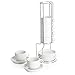 A SPACE SAVER & EASY TO MOVE - Porcelain cup/saucer set with a stacking stand to keep the set together, takes up very little countertop space. The stand is a big plus, makes it easy to move around from the kitchen to the living room for hosting purposes.