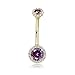 Always in trend, this 10K Yellow Gold belly button ring features a Purple colored round-shape Simulated Diamond Cubic Zirconia (CZ) wrapped in a halo frame of sparkly white CZ. This 014 gauge belly button ring secures with similar designed closure and it measures 25mm in length and 8mm in width