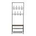 The bottom shelf can hold both shoes and supplies or decorative items. Made of metal and faux wood, the rack is 26'' long, 12.6'' deep and 68.9'' high.
