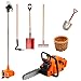 A set of 7 miniature gardening tools, including lawn mower, chainsaw, shovel, pestle, rake, shovel, small basket