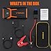 WHAT’S INCLUDED: GOOLOO Portable Car Battery Jump Starter Pack, Smart Jumper Clamp, Wall Charger, Car Charger, USB to Type-C Quick-Charge Cable, Carrying Case, User Manual.