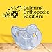 * CALMING ORTHODONTIC DESIGN: This calm Orthodontic shaped pacifier can adopt a baby’s mouth shape easily and reduces pressure on the jaw and teeth to develop of baby’s mouth, teeth and gums.