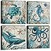 【Sea Animal Teal Sea Turtle Wall Decor Size】: 16 x 16 inch x 4 Panels (about 40 x 40cm/ piece, set of 4 panels). Style: Navy blue with gray hand painted watercolor painting printed Mediterranean ocean park animals themed pictures, Home interior decoration painting. Patterns: seahorse, Sea turtle, octopus and whale with seaweed starfish & retro gray beige nautical map background.