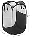 Measuring 21" L x 13" W x 18.25" H when open and collapses to less than 2 inches; total capacity of each laundry bin is 64 liters (17 gallons) by volume, with a maximum load capacity of 55 pounds