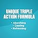 The unique triple action formula absorbs moisture, cools and controls odor* *Absorbs odor-causing sweat