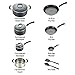 Set includes: 8 inches fry pan, 10.25 inches fry pan, 1 Egg Wonder fry pan, 1 quart; saucepan with lid, 3 quart; saucepan with lid, 5 quart; stockpot, stainless steel steamer insert, and 2 nylon tools