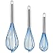 [What you can get]: 3 pcs blue silicone kitchen whisks. The whisk set include 3 sizes - - 12 inches, 10 inches, and 8 inches. You can choose the best suitable size when you are using. You can use the large whisk size for pancake batter, the Medium size for beating eggs, and the smallest size for blending a small batch of sauces.