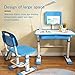TILTABLE DESKTOP: Tiltable desktop 0-60° promotes good posture for children and protects their eyesight. Including an embedded pull out drawer for storing pens, utensils, books, papers and all little things to reduce clutter, two handy hooks can hang backpack.