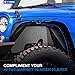 WRANGLER FENDER FLARES: Upgrade your factory fender flares with this replacement kit. Each flare is UV treated thermoplastic for long-lasting durability. No drilling required. Hardware not included.