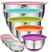 🍄 [EASY MEASURE & NON-SLIP] Quarts and liters are clearly engraved inside the bowls and fade proof, meet the demand of different measurement. A silicone non-slip bottom keeps the stainless bowls steady on counter tops when beating and whisking. Users can mix, beat, or whisk ingredients with little mess as the wide, deep bowls have high walls to prevent splatter.