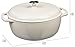 Cast iron covered dutch oven in white with side handles and fitted lid; oven safe to 400 degree Fahrenheit