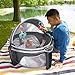 ADDITIONAL FEATURES – 14 square feet of playing area (48 inches wide, 26 inches tall), clip on full coverage canopy, touchscreen enabled entertainment pouch, mesh sides for easy visibility and travel bag with shoulder strap included.