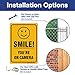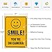 Highly visible yellow and black "Smile You're On Camera" sign is sure to catch the attention of possible intruders