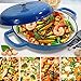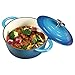 Cast iron covered dutch oven in blue with side handles and fitted lid; oven safe to 400 degree Fahrenheit