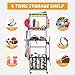 🏀【Multifunctional Sports Equipment Organizer】 This rolling storage rack features 4 tier shelves with wire mesh, ideal to store sports gears like baseballs, gloves, basketballs, jacket and more. With removable storage hooks, you can store baseball cap, helmet, racket all in one storage stand.