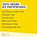 100% Vegan: formulated without Parabens, Sulfates, Mineral oil, Petrolatum, or Formaldehyde; certified cruelty-free