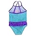 Awesome sublimation print design; UPF 50+ material for UVB and UVA protection and worry-free sun time; Cross back spaghetti straps; 4 way stretch fabric, elastic leg openings and elastic waist for comfort and a better fit; Ruffle trim accents; fully lined