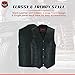 Multifeatured Vest for Men: The motorcycle denim vest for men contains two inside concealed arsenal pockets made of special heavy-duty textile with built-in holsters and snaps closing, 2 zippered outside pockets, an Inside cell phone pocket, and a front gun metal snap that protects wind and rain while riding.