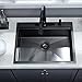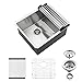 【HANDMADE WORKSTATION SINK WITH SINGLE-TIER TRACK】Integrated ledge as a track for sliding the built-in custom accessories, and it allows you to work directly over the sink with ease. Package includes Kitchen Sinks, heavy-duty Cutting Board, Bottom Rinse Grid, Sink Drain Strainer, Cutout Template, Mounting Hardware, and Installation Guide.
