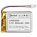 BASIC INFO—Voltage:3.7V; Typical capacity: 880mAh, Min capacity: 745mAh; Weight: approximate 17.6g; Size: 5.5 x 34.5 x 50mm(WxLxH)