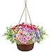 【Hanging Planter with Fake Flowers Kit】This hanging basket with artificial flowers plants includes 1 pcs hanging woven flower basket, 6 pcs artificial flowers, 2 pcs green ferns.