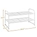 MULTIPURPOSE 2-TIER RACK - Stores up to 9 pairs of shoes for men, women, and children. Rack holds up to 6 shoes on shelves. Store 3 pairs of low-profile shoes like flats, sandals, and sneakers beneath the rack. 5.5” of space between tiers, 3.5” beneath the rack.