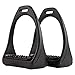 The outside of the stirrup is longer than the inside to relieve pressure from your knees with your feet parallel to the ground.
