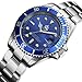 Round watch featuring unidirectional blue dive bezel with silver-tone trim and logoed dial with luminous hands/markers