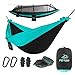 FEATURES: This outdoor hammock includes set-up accessories such as durable tree straps, carabiners, and tree rope to hold up the included removable mosquito bug net. The parachute fabric is water resistant. The compact travel bag doubles as an attached pocket so you can put your gadgets or tactical camp stuff in, iPhone, camera equipment, or use it as a cup holder for your hydration water bottle