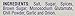 Ingredients: SALT, MONOSODIUM GLUTAMATE, SPICES, GARLIC, ONION, BELL PEPPERS, BUTTER FLAVOR (CORN STARCH, MODIFIED TAPIOCA STARCH, DEXTROSE, GUM ARABIC AND ARTIFICIAL FLAVOR). LEMON POWDER (SUGAR, CONCENTRATED LEMON OIL, CITRAL AND SILICON DIOXIDE [FREE FLOW AGENT]), CITRIC ACID, AND TENDERIZER (PROTEOLYTIC ENZYME DERIVED FROM ASPERGILLUS FLAVUS ORYZAE, AND FROM PAPAYA).'