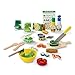 Healthy toy Food: Healthy play food for toddlers set includes 12 lettuce leaves, 4 tomato slices, 4 cucumber slices, 4 carrot crinkles, and 8 pepper rings along with a larger serving bowl, four individual bowls, and 1 pair of tongs