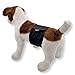 Women's feminine napkin works perfectly and attach with the adhesive strip. You decide how thick of pad you need for your dog.