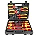 This electricial set includes VDE insulated screwdrivers: 0.6x3.5x100mm, 0.8x4.0x100mm, 1.0x5.5x100mm, 1.2x6.5x150mm slotted, and PH0x75mm, PH1x100mm, PH2x100mm Philips. It also includes a voltage test screwdriver.