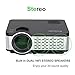 【Built in HI-FI Stereo Sound Box with SRS system】 : Including box body, sound chamber, amplifier board and 2*5w stereo speakers with SRS sound system. It is a complete sound box system, not just a speaker as competitors’ design. Excellent in base performance ,enhance sense of sound range to be wide and board. This home theater projector can pump out its original crisp treble, detailed mids, and resonating X-bass for enjoying music and movie
