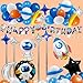 🪐Space Theme Party Set: Latex balloons: 35pcs mixed color round balloons, 4pcs long balloons. Aluminum foil balloons:1 astronaut,1 rocket, 1round astronaut, 1 moon, 1 star, 8 blue four-pointed star. Others: 1 banner, 1 white ribbon, 1 120inch strip light(not include battery), 1 glue point.