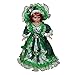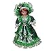 Victorian girl dolls wear colorful dress with ruffles at the neckline and hat with flower on top