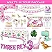 🍃 THREE REX BIRTHDAY PARTY DECORATIONS INCLUDES - 84 x 12’’ pink latex balloons | 20 x 5’’ latex balloons | 6 x artificial leaves | 12 x foil balloons | 1 x backdrop | 1 x banner | 1 x tablecloth | 1 x cake topper | 10 x cupcake toppers | 1 x crown | 1 x poster | 1 x marker | poster stand | balloon strip | glue dots | ribbons