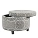 STORAGE OTTOMAN: Created with premium soft and durable woven fabric our Round Ottoman with Storage in Classic Gray Medallion design printed on a textured base offers a timeless style | Perfectly completed with tapered wood legs in a grey wash finish