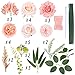 Packaging Details: Soft Beige Roses x5, Caramel Roses x4, Champagne Dahlias x3, Light Pink Peony x4, Light Brown Hydrangeas x5, Short Stem Plants x6, Green Leaves and Foliage x24 (including 6 styles), 1 Roll of Ribbon, 50 Easily bendable and trimmable flower stems, and One glue stick for attaching flower stems.