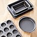 6-piece bakeware set includes a 9 x 5-inch loaf pan, 2 round 9-inch cake pans, a 12-cup muffin pan, a 13 x 9-inch roast pan, and a 13 x 9-inch baking sheet
