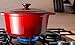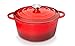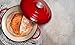 Cast iron covered dutch oven in red with side handles and fitted lid; oven safe to 400 degree Fahrenheit