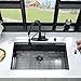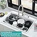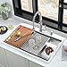 【Workstation Sink For Largest Space】Workstation kitchen sink with integrated ledge that allows you to slide custom accessories across the sink maximize bowl size and offer more usable space in the sink, allowing large items like baking sheets to lie flat for easy clean up.