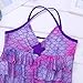 Spaghetti shoulder straps are criss cross at back, V-neckline with a stitched starfish. Swim tops front with 3 tiered ruffles, printed with scales pattern