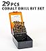 SPECIFICATIONS:29PCS COBALT DRILL BIT SET:1/16,5/64,3/32,7/64,1/8,9/64,5/32,11/64,3/16,13/64,7/32,15/64,1/4,17/64,9/32,19/64,5/16,21/64,11/32,32/64,3/8,25/64,13/32,27/64,7/16,29/64,15/32,31/64,1/2. Sizes from 1/8 to 1/2 with triangle shank.