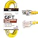 ENHANCED VISIBILITY FOR SAFER WORK SITE: The lighted end of this heavy-duty 15 amp 25 ft extension cord indicates when the power is on, providing increased visibility. The bright yellow SJTW cord jacket reduces the risk of tripping over the cable while connected to electrical appliances.
